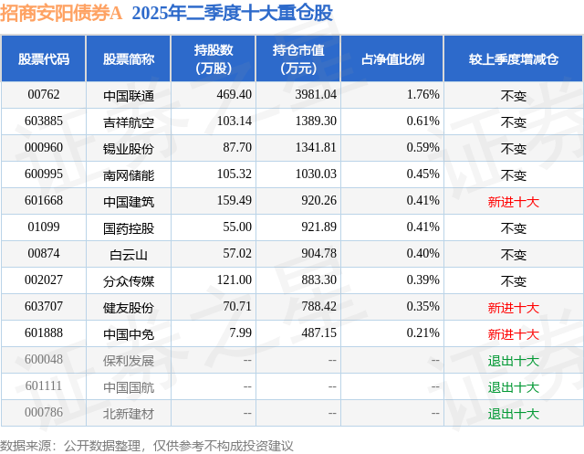 根据2025基金半年报公募基金重仓股数据,重仓该股的公募基金共5家,其中持有数量最多的公募基金为招商基金的招商安阳债券A。招商安阳债券A目前规模为21.85亿元,最新净值1.0532(9月30日),较上一交易日上涨0.22%,近一年上涨5.32%。该公募基金现任基金经理为尹晓红 蔡振。尹晓红在任的基金产品包括:招商安盈债券A,管理时间为2017年12月30日至今,期间收益率为55.87%;招商安庆债券,管理时间为2019年1月31日至今,期间收益率为36.38%;招商瑞和1年持有期混合A,管理时间为2021年3月24日至今,期间收益率为15.04%。蔡振在任的基金产品包括:招商安盈债券A,管理时间为2021年8月5日至今,期间收益率为22.03%;招商中证1000指数增强A,管理时间为2021年11月5日至今,期间收益率为37.62%;招商安嘉债券,管理时间为2022年9月20日至今,期间收益率为24.37%。