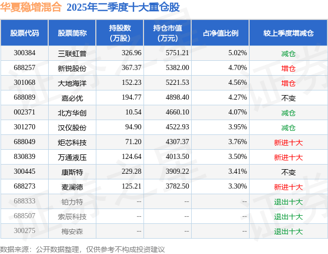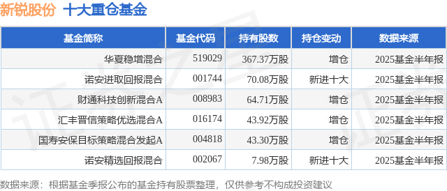 根据2025基金半年报公募基金重仓股数据,重仓该股的公募基金共6家,其中持有数量最多的公募基金为华夏基金的华夏稳增混合。华夏稳增混合目前规模为11.46亿元,最新净值3.268(9月30日),较上一交易日上涨1.3%,近一年上涨51.93%。该公募基金现任基金经理为彭海伟。彭海伟在任的基金产品包括:华夏景气成长一年持有混合发起式A,管理时间为2024年3月28日至今,期间收益率为60.37%。
