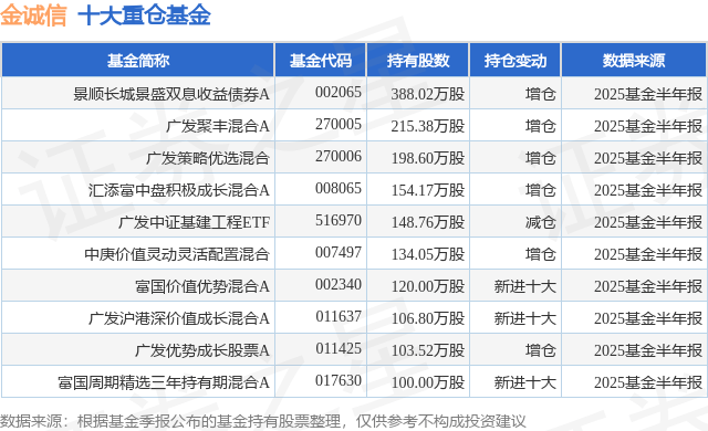 根据2025基金半年报公募基金重仓股数据,重仓该股的公募基金共91家,其中持有数量最多的公募基金为景顺长城基金的景顺长城景盛双息收益债券A。景顺长城景盛双息收益债券A目前规模为105.57亿元,最新净值1.231(10月9日),较上一交易日上涨0.82%,近一年上涨10.01%。该公募基金现任基金经理为李怡文 邹立虎 李曾卓卓。李怡文在任的基金产品包括:景顺长城景颐双利债券A,管理时间为2021年4月30日至今,期间收益率为24.47%;景顺景颐招利6个月持有期债券A,管理时间为2021年4月30日至今,期间收益率为32.89%;景顺长城安泽回报一年持有混合A,管理时间为2021年4月30日至今,期间收益率为39.15%;景顺景颐嘉利6个月持有期债券A,管理时间为2021年6月16日至今,期间收益率为22.73%。邹立虎在任的基金产品包括:景顺长城安盈回报一年持有混合A,管理时间为2021年11月16日至今,期间收益率为42.36%;景顺景颐招利6个月持有期债券A,管理时间为2022年3月12日至今,期间收益率为25.36%;景顺长城华城稳健6个月持有期混合A,管理时间为2022年3月12日至今,期间收益率为28.98%。