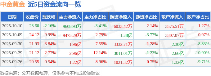 证券之星消息,截至2025年10月10日收盘,中金黄金(600489)报收于23.6元,下跌2.16%,换手率2.46%,成交量119.15万手,成交额28.16亿元。