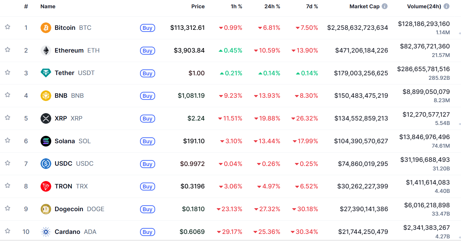 全球最大加密货币比特币日内跌幅达13.5%,失守11万美元关口,最低报105930美元。比特币随后收窄跌幅,美东时间周五晚些时候,比特币交投于约11.3万美元一线。