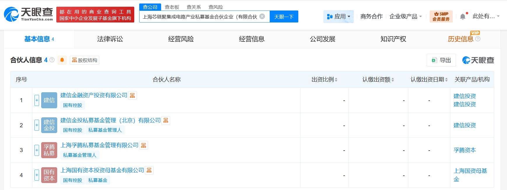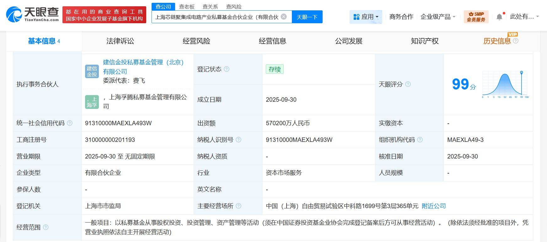 天眼查工商信息显示,近日,上海芯链聚集成电路产业私募基金合伙企业(有限合伙)成立,执行事务合伙人为建信金投私募基金管理(北京)有限公司、上海孚腾私募基金管理有限公司,出资额57.02亿人民币,经营范围为以私募基金从事股权投资、投资管理、资产管理等活动。合伙人信息显示,该基金由建信金融资产投资有限公司、建信金投私募基金管理(北京)有限公司、上海孚腾私募基金管理有限公司、上海国有资本投资母基金有限公司共同出资。