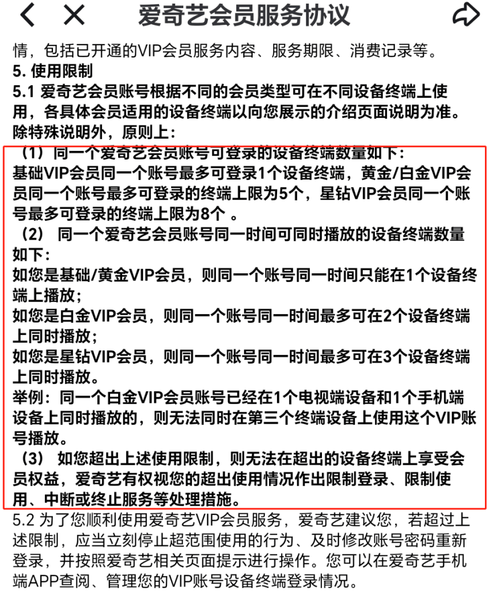 爱奇艺则规定,基础VIP会员最多可登录1个设备终端,黄金/白金VIP会员最多可登录的终端上限为5个,星钻VIP最多可登录8个。