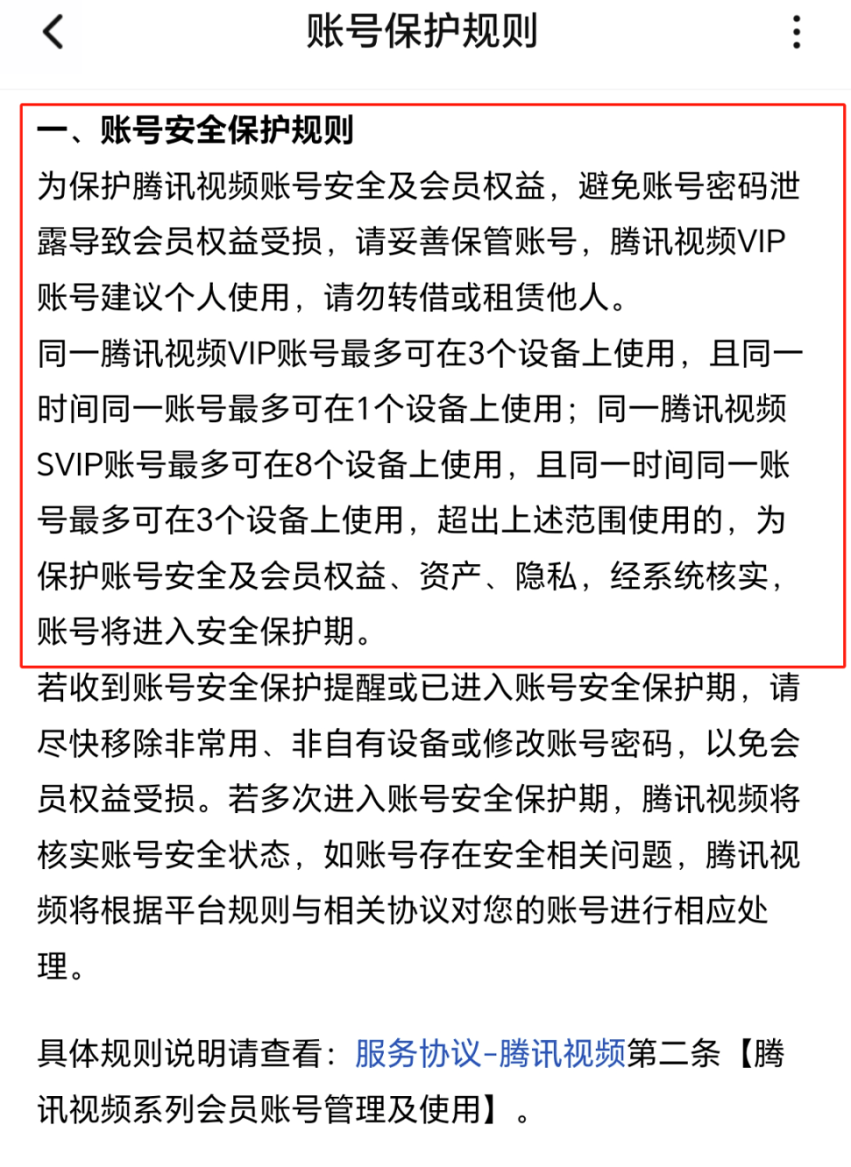 在腾讯视频App“登录设备管理”的页面中,记者注意到,腾讯视频VIP账号最多支持3台设备登录,仅允许1台设备同时播放;SVIP会员则可登录8台设备,并允许3台设备同时进行播放;家庭卡会员则可登录10台设备,允许4台设备同时播放。该平台账号安全保护规则指出,超出上述范围使用的,为保护账户安全及会员权益、资产、隐私,经系统核实,账号将进入安全保护期。