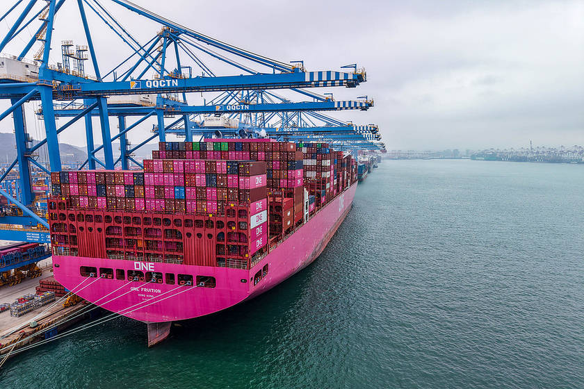 2025年10月10日,山东青岛,货轮正在装卸集装箱。(图源:视觉中国)
