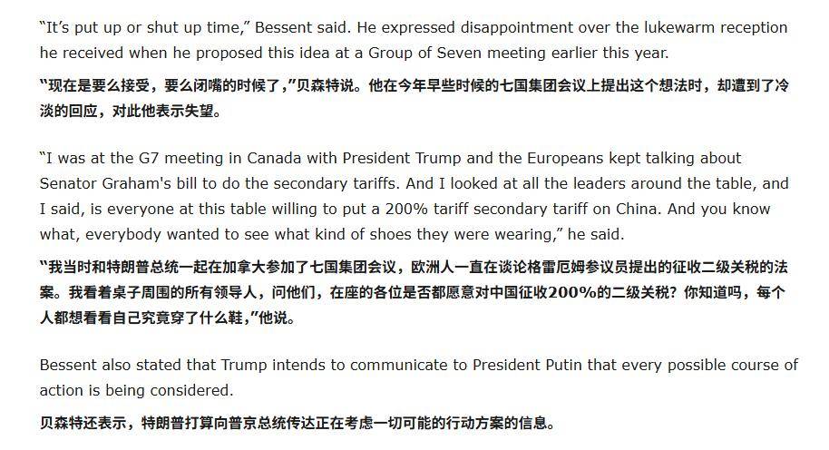 其次,这一行动也是美国对其欧洲盟友的压力测试。在今年6月的G7峰会上,贝森特曾试图通过谈判测试欧洲国家的态度,他甚至在谈话中明确给出“选择”——要么支持美国对俄罗斯的经济制裁,要么闭嘴不表态。但欧洲国家在这一问题上显得十分谨慎与回避,集体沉默未作回应。