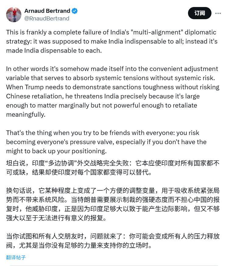 长期以来,印度奉行的是一种“多边结盟”的外交政策,试图在大国间保持平衡。然而,现实却是,印度的这一策略使其处于尴尬境地:既没有足够的硬实力来捍卫自己的独立外交,也未能避免成为大国博弈中的牺牲品。贝特朗指出,印度想成为每个大国都需要的合作伙伴,但实际上,印度反而变成了一个可以被“牺牲”的对象。