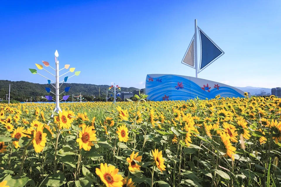 「大佳河滨公园」地点位于台北市中山桥、大直桥之间,每年秋天都有不同主题的花海接力登场,今年第一波由最受欢迎的「向日葵」打头阵,种植「橙花黑心」「橙花黄心」2个品种的向日葵,总数超过18万株,花海面积超过1500坪,规模比往年增加4倍!过去向日葵花海大约10月才会盛开,今年提早半个月,开花率也超过半数,预估今年「最佳赏花期」会落在9月底~10月初,民众可以把握好天气出门赏花!未来还会有百日草、波斯菊花海接力绽放!