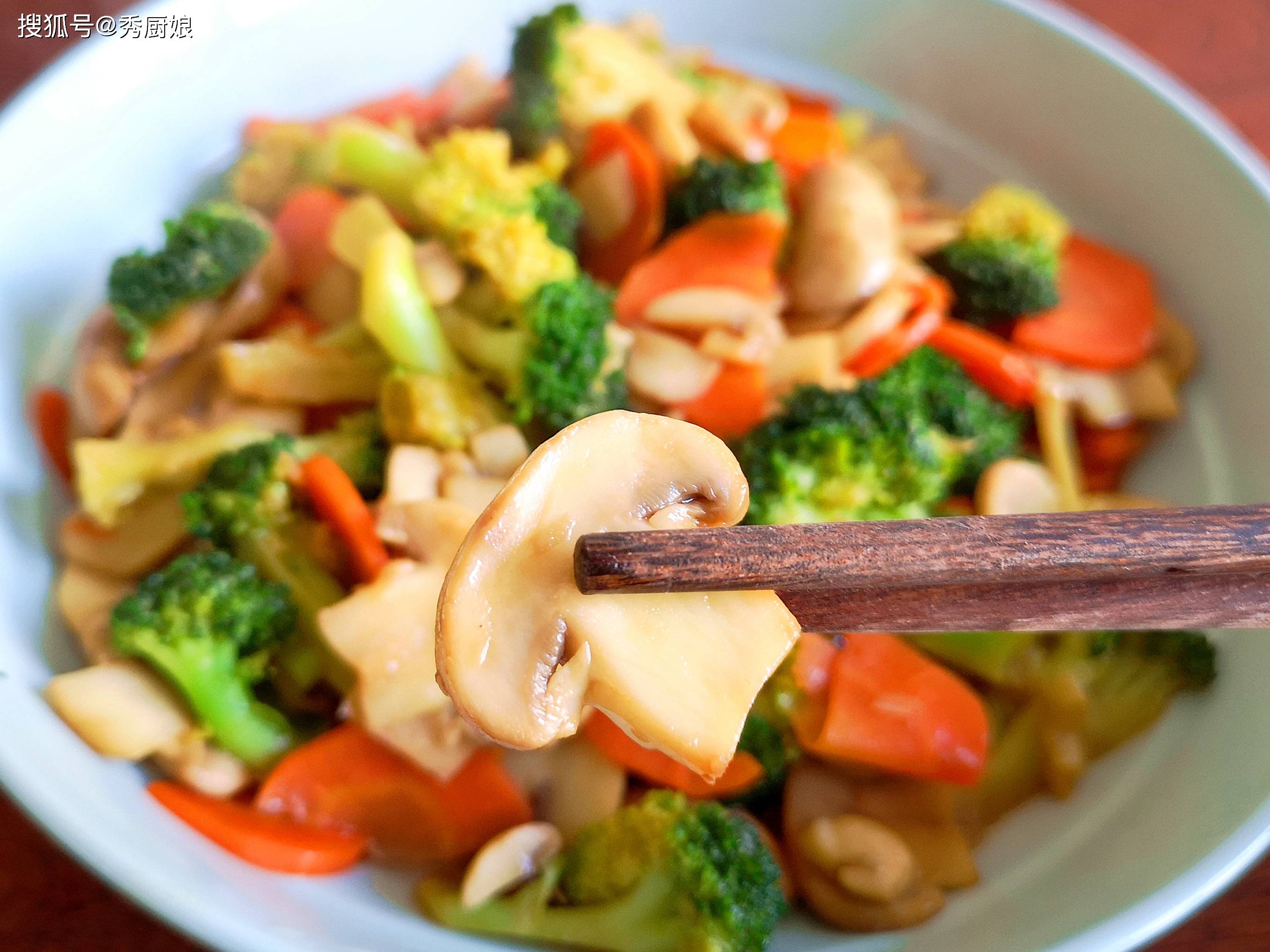 3.锅里放油,先倒入口蘑片煸炒至微黄,出香味。然后加入焯好的西兰花和胡萝卜,快速翻炒。