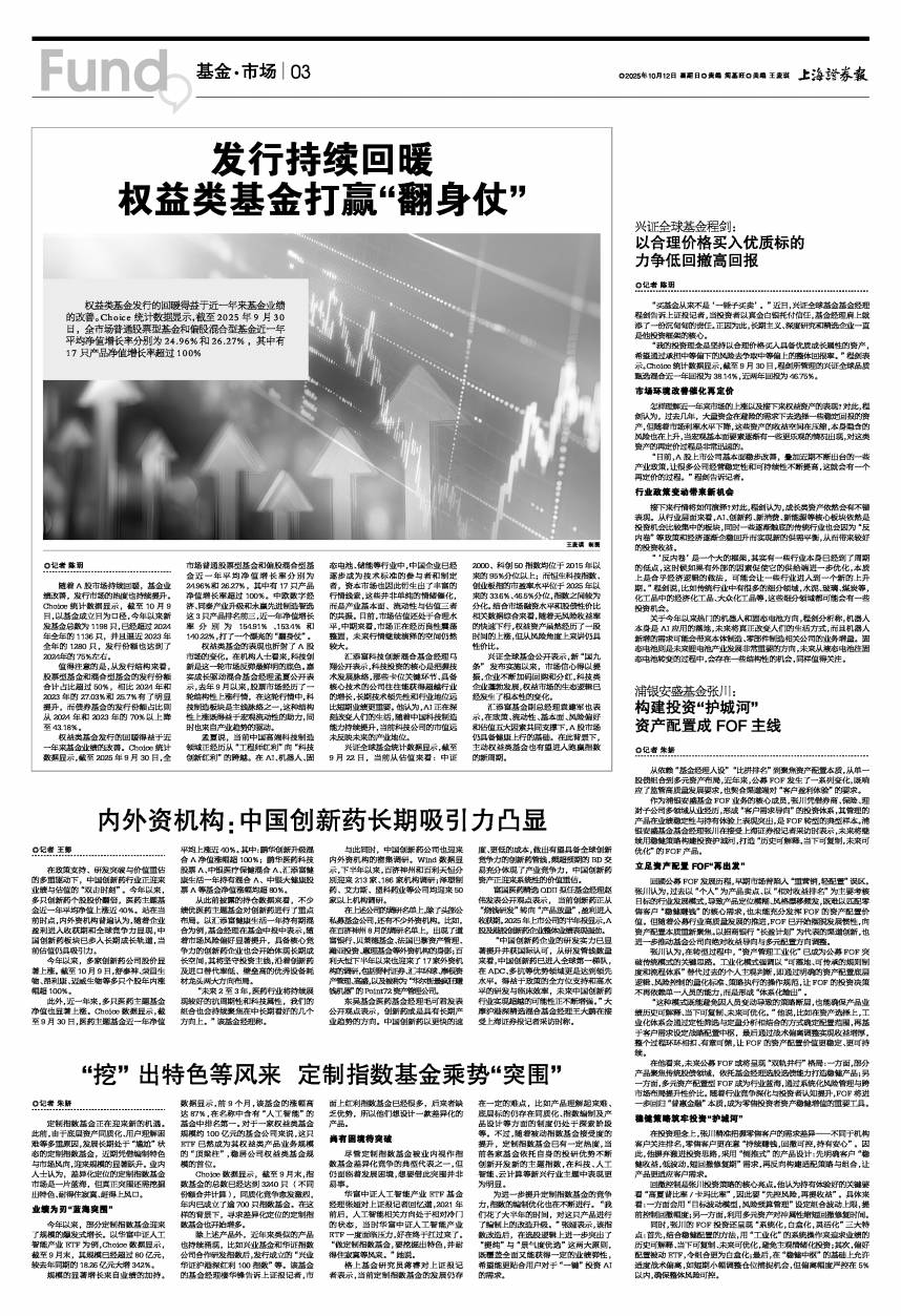 王麦琪 制图 发行持续回暖 权益类基金打赢“翻身仗” 权益类基金发行的回暖得益于近一年来基金业绩的改善。Choice统计数据显示,截至2025年9月30日,全市场普通股票型基金和偏股混合型基金近一年平均净值增长率分别为24.96%和26.27%,其中有17只产品净值增长率超过100% ◎记者 陈玥 随着A股市场持续回暖,基金业绩改善,发行市场的热度也持续提升。Choice统计数据显示,截至10月9日,以基金成立日为口径,今年以来新发基金总数为1198只,已经超过2024年全年的1136只,并且逼近2023年全年的1280只,发行份额也达到了2024年的75%左右。 值得注意的是,从发行结构来看,股票型基金和混合型基金的发行份额合计占比超过50%,相比2024年和2023年的27.03%和25.7%有了明显提升,而债券基金的发行份额占比则从2024年和2023年的70%以上降至43.18%。 权益类基金发行的回暖得益于近一年来基金业绩的改善。Choice统计数据显示,截至2025年9月30日,全市场普通股票型基金和偏股混合型基金近一年平均净值增长率分别为24.96%和26.27%,其中有17只产品净值增长率超过100%。中欧数字经济、同泰产业升级和永赢先进制造智选这3只产品排名前三,近一年净值增长率分别为154.91%、153.4%和140.22%,打了一个漂亮的“翻身仗”。 权益类基金的表现也折射了A股市场的变化。在机构人士看来,科技创新是这一轮市场反弹最鲜明的底色。嘉实成长驱动混合基金经理孟夏公开表示,去年9月以来,股票市场经历了一轮结构性上涨行情,在这轮行情中,科技制造板块是主线脉络之一,这种结构性上涨既得益于宏观流动性的助力,同时也来自产业趋势的驱动。 孟夏说,当前中国高端科技制造领域正经历从“工程师红利”向“科技创新红利”的跨越。在AI、机器人、固态电池、储能等行业中,中国企业已经逐步成为技术标准的参与者和制定者,资本市场也因此衍生出了丰富的行情线索,这些并非单纯的情绪催化,而是产业基本面、流动性与估值三者的共振。目前,市场估值还处于合理水平,中期来看,市场正在经历良性震荡整固,未来行情继续演绎的空间仍然较大。 汇添富科技创新混合基金经理马翔公开表示,科技投资的核心是把握技术发展脉络,那些卡位关键环节、具备核心技术的公司往往能获得超越行业的增长,长期技术领先性和行业地位远比短期业绩更重要。他认为,AI正在深刻改变人们的生活,随着中国科技制造能力持续提升,当前科技公司的市值远未反映未来的产业地位。 兴证全球基金统计数据显示,截至9月22日,当前从估值来看:中证2000、科创50指数均位于2015年以来的95%分位以上;而恒生科技指数、创业板指的市盈率水平位于2025年以来的33.6%、46.5%分位,指数之间较为分化。结合市场融资水平和股债性价比相关数据综合来看,随着无风险收益率的快速下行,权益资产虽然经历了一段时间的上涨,但从风险角度上来讲仍具性价比。 兴证全球基金公开表示,新“国九条”发布实施以来,市场信心得以提振,企业不断加码回购和分红,科技类企业蓬勃发展,权益市场的生态逻辑已经发生了根本性的变化。 汇添富基金副总经理袁建军也表示,在政策、流动性、基本面、风险偏好和估值五大因素共同支撑下,A股市场仍具备健康上行的基础。在此背景下,主动权益类基金也有望进入跑赢指数的新周期。