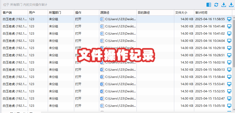 记录终端计算机的文件操作信息,包括本地磁盘、移动存储、网络路径、共享目录的所有文档创建、访问、修改、复制、移动、重命名、删除等操作。