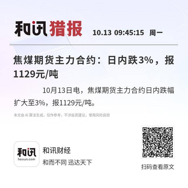 10月13日电,焦煤期货主力合约日内跌幅扩大至3%,报1129元/吨。