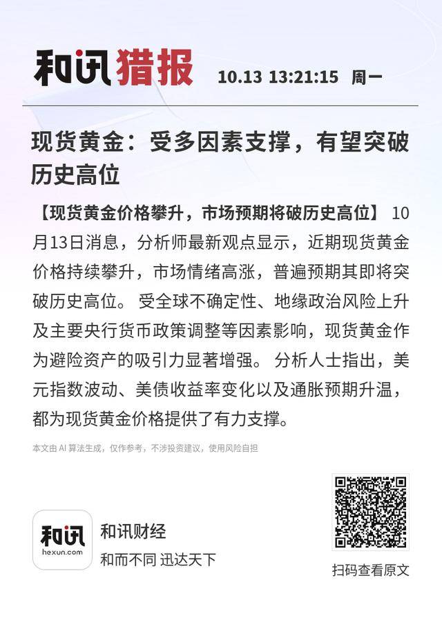 【现货黄金价格攀升,市场预期将破历史高位】10月13日消息,分析师最新观点显示,近期现货黄金价格持续攀升,市场情绪高涨,普遍预期其即将突破历史高位。 受全球不确定性、地缘政治风险上升及主要央行货币政策调整等因素影响,现货黄金作为避险资产的吸引力显著增强。 分析人士指出,美元指数波动、美债收益率变化以及通胀预期升温,都为现货黄金价格提供了有力支撑。