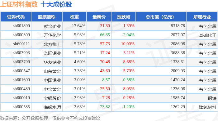 证券之星消息,10月13日,上证材料(000033)指数报收于3469.72点,涨1.79%,成交1248.67亿元,换手率3.36%。当日该指数成份股中,上涨的有20家,白银有色以10.04%的涨幅领涨,下跌的有29家,桐昆股份以5.82%的跌幅领跌。