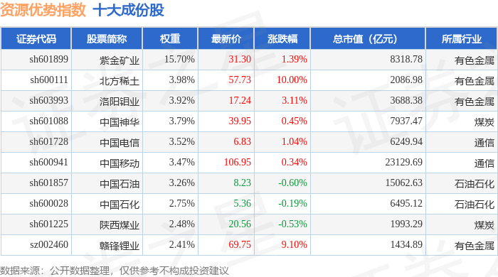 证券之星消息,10月13日,资源优势(399319)指数报收于3153.59点,涨1.92%,成交1654.6亿元,换手率1.89%。当日该指数成份股中,上涨的有45家,白银有色以10.04%的涨幅领涨,下跌的有54家,天铁科技以4.85%的跌幅领跌。