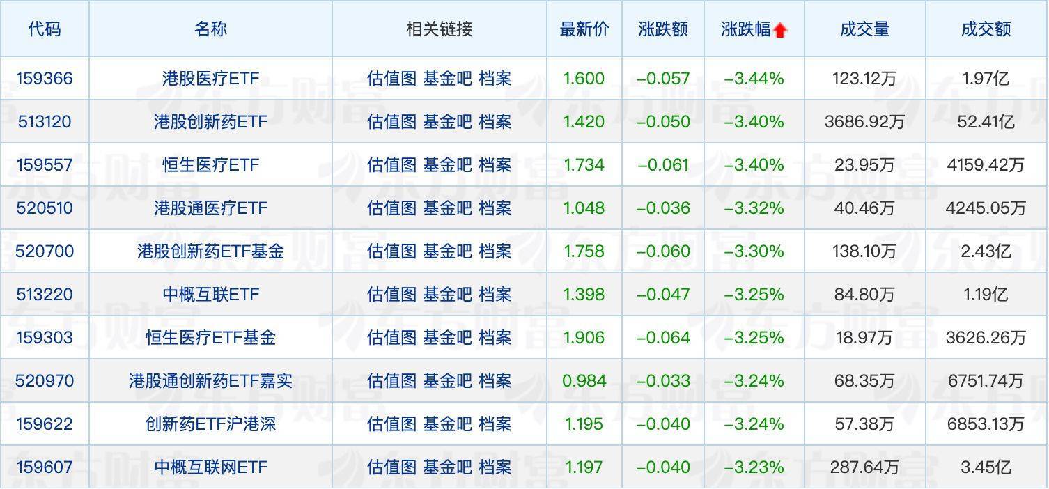 下跌方面,港股创新药、医疗相关ETF回调居前,多只产品跌幅超过3%。