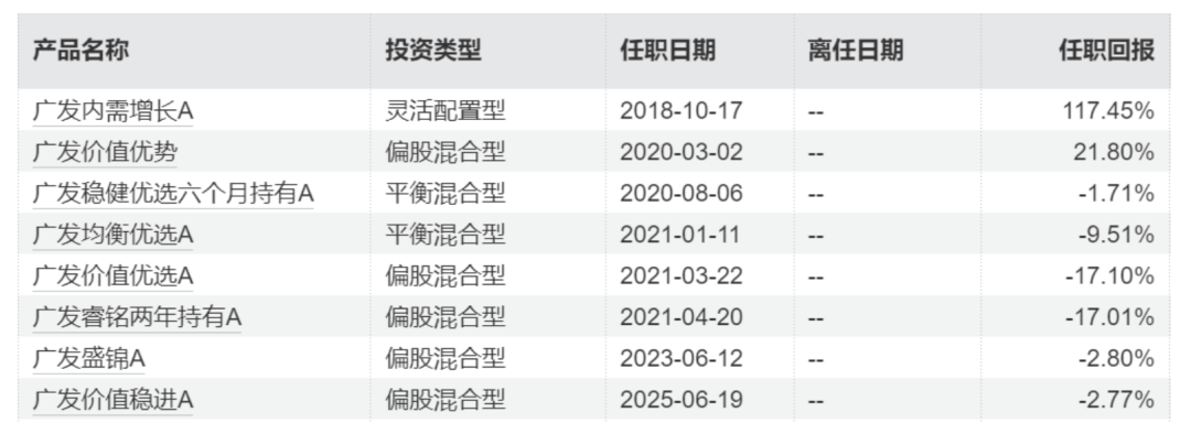 从更长的时间来看,王明旭的投资表现似乎也不是太理想。Wind数据显示,截至10月10日,其在管8只基金中,有6只的任职回报为负。其中,管理广发价值优选A1663天,任期回报为-17.1%;管理广发睿铭两年持有A1634天,任期回报为-17.01%。