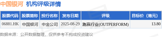 截至2025年10月13日收盘,中国银河(06881.HK)报收于11.47港元,下跌0.78%,成交量4667.53万股,成交额5.26亿港元。投行对该股的评级以跑赢行业(OUTPERFORM)为主,近90天内共有1家投行给出跑赢行业(OUTPERFORM)评级,近90天的目标均价为13.8港元。中金公司最新一份研报给予中国银河跑赢行业(OUTPERFORM)评级,目标价13.8港元。
