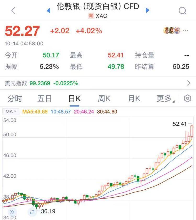 现货白银持续走高日内涨幅扩大至4.02%,报52.27美元/盎司。