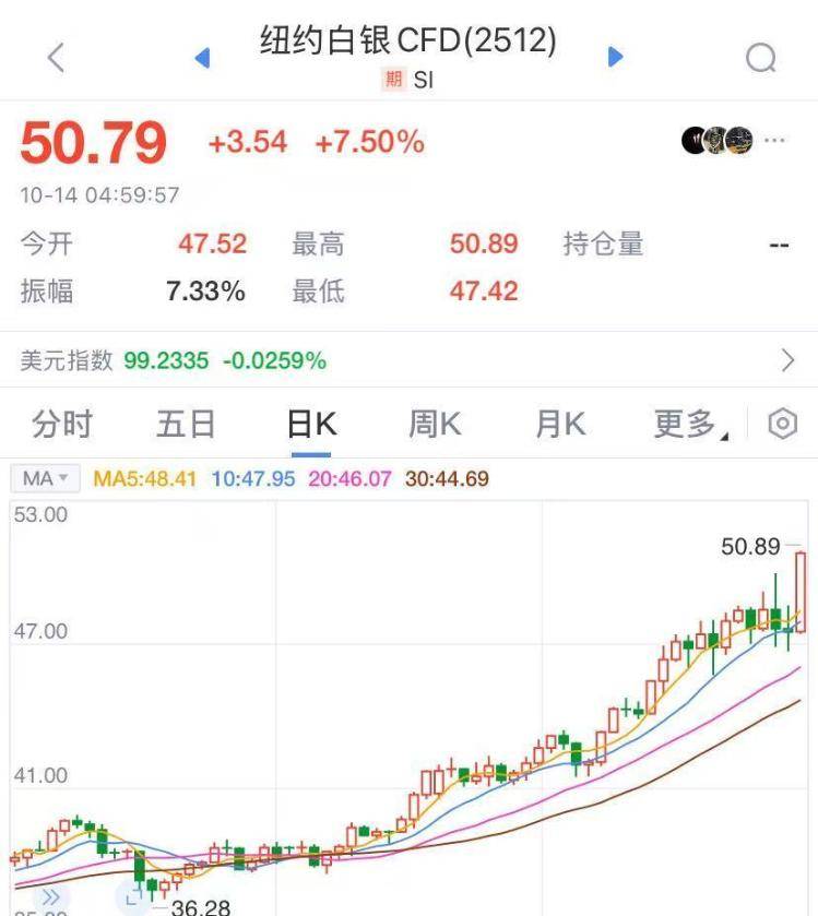 美东时间周一,COMEX黄金期货(12月交割)收涨3.26%,报4130.72美元/盎司;COMEX白银期货(12月交割)收涨7.50%,报50.79美元/盎司。