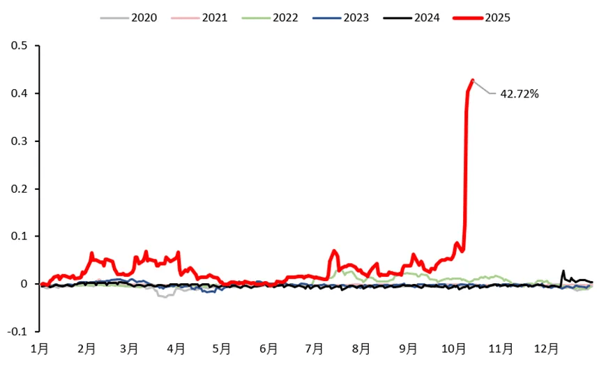 这一现象已致白银现货与期货间的价格关系出现错位。截至10月13日,伦敦银相对纽约白银期货近月合约(指期货交易中距离当前日期最近且即将到期的合约)的溢价已达2.31美元/盎司,处于近年来高位。