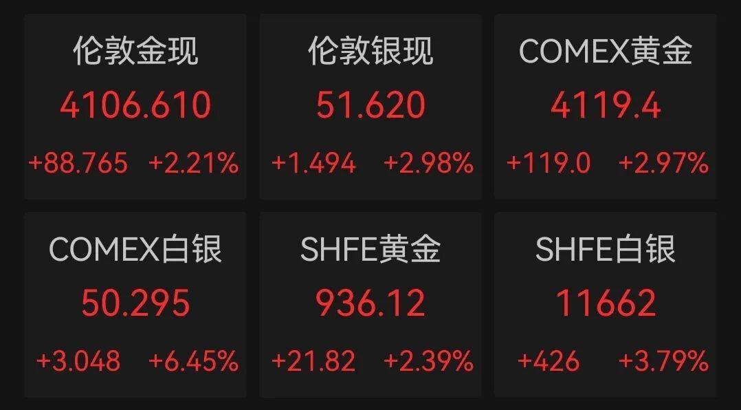 另一方面,现货黄金价格13日盘中突破每盎司4100美元关口,延续此前连续8周上涨的强势表现,再创历史新高。铂金与钯金价格亦大幅走高。