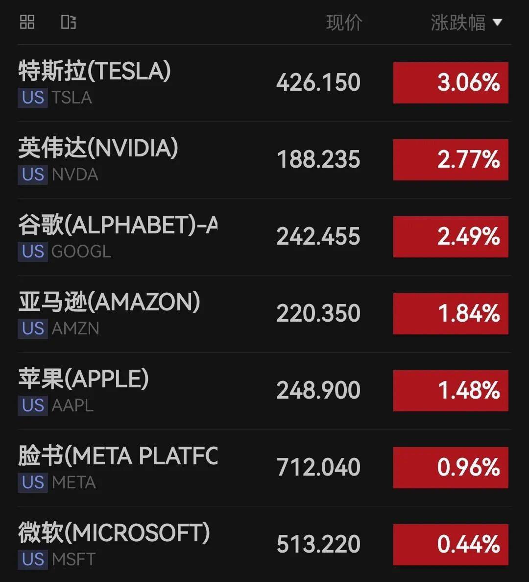 大型科技股涨多跌少,截至发稿,特斯拉涨3.06%,英伟达涨2.77%,谷歌涨2.49%,亚马逊涨1.84%,苹果涨1.48%,脸书涨0.96%,微软涨0.44%。