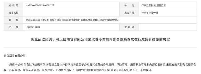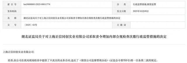 湖北证监局10月9日披露一则行政监管措施,对上海正信同创实业有限公司采取责令增加内部合规检查次数行政监管措施。