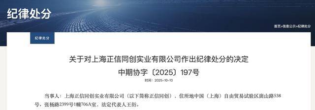 另外,中国期货业协会10月10日公告,对上海正信同创实业有限公司作出纪律处分。