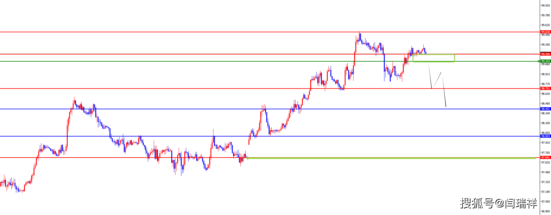 从多周期分析,周线价格经过前期持续震荡后于上周进行站稳,目前周线支撑于98区域,后续关注进一步中期多头。从日线级别看,随着时间的推移目前日线支撑于98.40区域,价格此位置之上波段进一步上涨。从四小时上看,在上周五价格跌破四小时支撑位置,则短线偏承压,同时我们需要注意上周跳空缺口位置,目前四小时阻力于99.10-20区间,价格短期在此位置上下盘整,后续持续关注此位置进一步跌破开启短期的调整动作。一小时上价格目前同样偏承压。所以综合看目前激进者依托上周高点下于今日早盘附近看承压,保守者可以等待跌破99.10后再跟随。