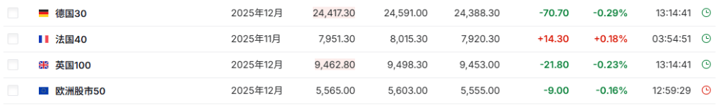 今日亚市盘中,美国股指期货下跌,标普500指数期货下跌0.4%,纳斯达克100指数期货下跌0.5%。德国、英国等主要股指小幅下跌,欧洲股指50指数跌0.16%。