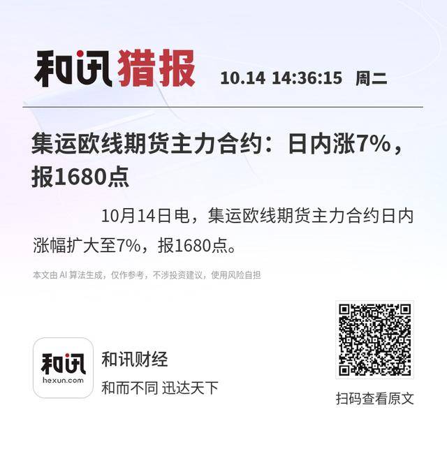 10月14日电,集运欧线期货主力合约日内涨幅扩大至7%,报1680点。