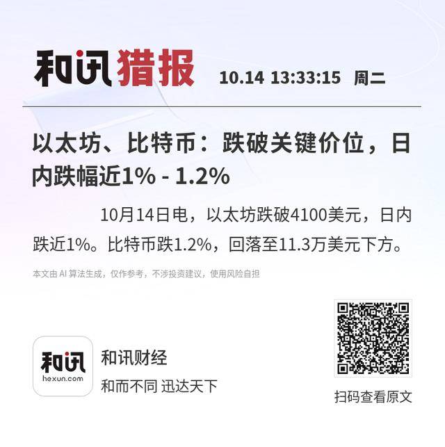 10月14日电,以太坊跌破4100美元,日内跌近1%。比特币跌1.2%,回落至11.3万美元下方。
