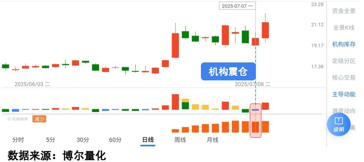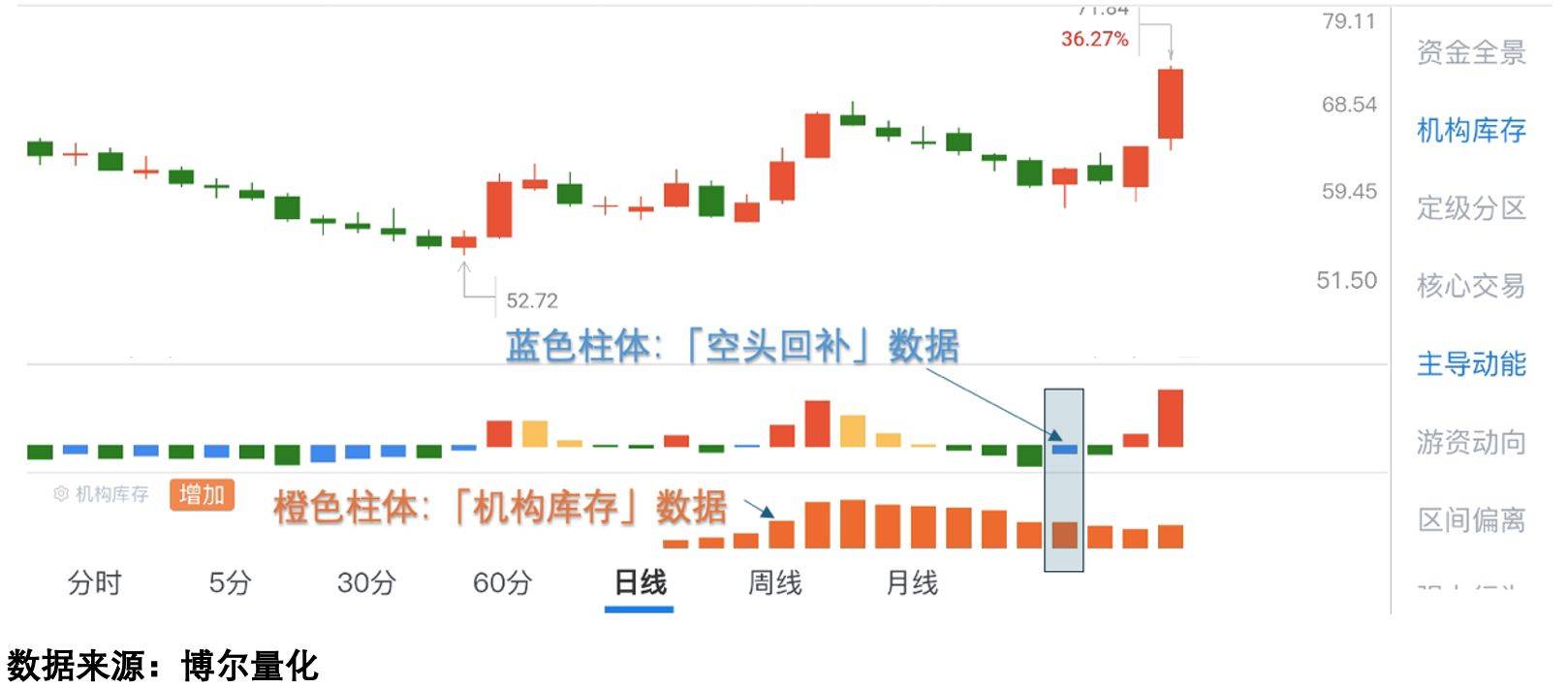 图中橙色柱体反映的是机构资金活跃程度的数据指标。当这个指标越活跃时,意味着参与交易的机构资金越多、持续时间越长。蓝色柱体则反映特定交易行为特征的数据指标——当两者同时出现特定组合时,往往预示着重要转折点的到来。