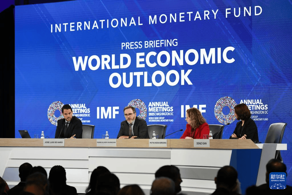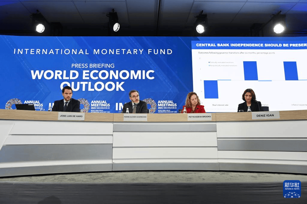 当地时间2025年10月14日,美国华盛顿,国际货币基金组织首席经济学家皮埃尔-奥利维耶·古兰沙(左二)在《世界经济展望报告》新闻发布会上讲话。国际货币基金组织(IMF)14日发布最新一期《世界经济展望报告》,小幅上调今年世界经济增长预期。IMF指出,关税冲击正进一步削弱全球经济增长前景,世界经济仍较为脆弱。新华社记者 李睿 摄