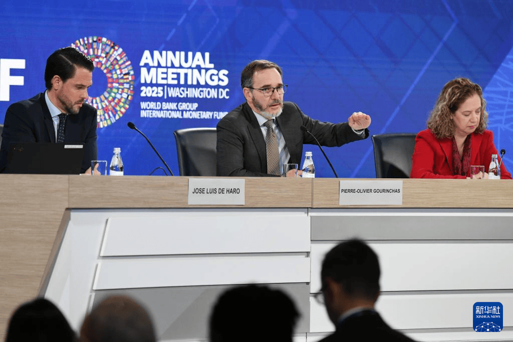 当地时间2025年10月14日,美国华盛顿,国际货币基金组织首席经济学家皮埃尔-奥利维耶·古兰沙(中)在《世界经济展望报告》新闻发布会上讲话。国际货币基金组织(IMF)14日发布最新一期《世界经济展望报告》,小幅上调今年世界经济增长预期。IMF指出,关税冲击正进一步削弱全球经济增长前景,世界经济仍较为脆弱。新华社记者 李睿 摄