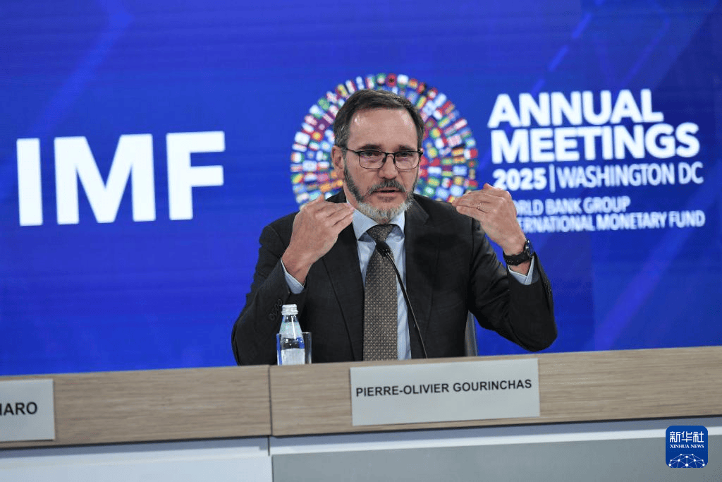 当地时间2025年10月14日,美国华盛顿,国际货币基金组织首席经济学家皮埃尔-奥利维耶·古兰沙在《世界经济展望报告》新闻发布会上讲话。国际货币基金组织(IMF)14日发布最新一期《世界经济展望报告》,小幅上调今年世界经济增长预期。IMF指出,关税冲击正进一步削弱全球经济增长前景,世界经济仍较为脆弱。新华社记者 李睿 摄