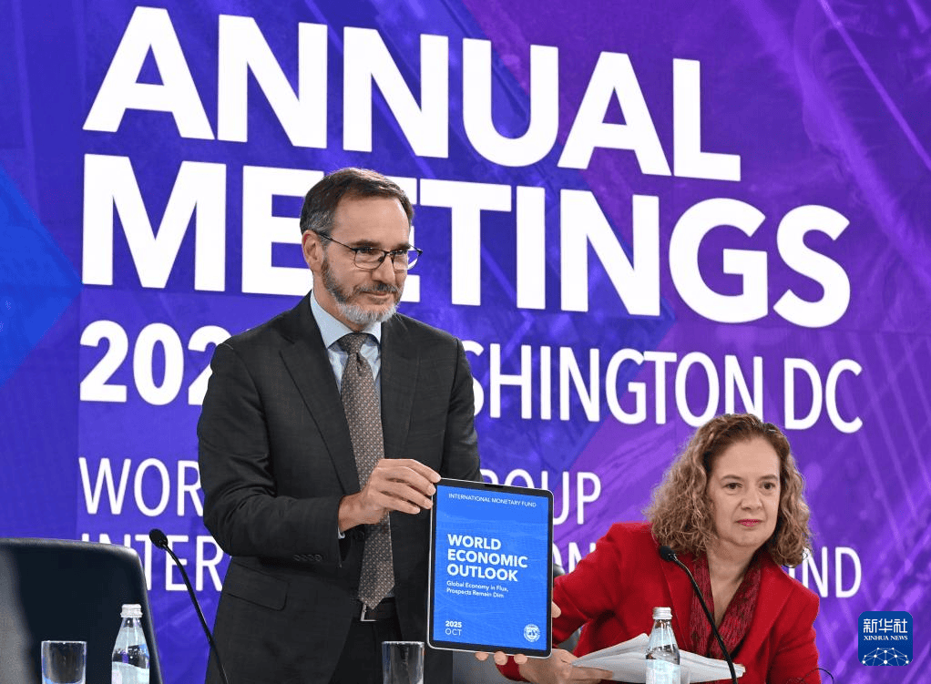 当地时间2025年10月14日,美国华盛顿,国际货币基金组织首席经济学家皮埃尔-奥利维耶·古兰沙(左)在《世界经济展望报告》新闻发布会上展示报告。国际货币基金组织(IMF)14日发布最新一期《世界经济展望报告》,小幅上调今年世界经济增长预期。IMF指出,关税冲击正进一步削弱全球经济增长前景,世界经济仍较为脆弱。新华社记者 李睿 摄