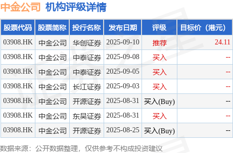 投行对该股的评级以买入为主,近90天内共有4家投行给出买入评级,近90天的目标均价为24.11港元。华创证券最新一份研报给予中金公司推荐评级,目标价24.11港元。