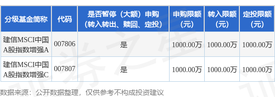 证券之星消息,10月15日建信基金管理有限责任公司发布《建信MSCI中国A股指数增强型证券投资基金基金暂停大额申购、大额转换转入、定期定额投资公告》。公告中提示,为保护投资者利益,自2025年10月17日起建信MSCI中国A股指数增强型证券投资基金基金暂停大额申购、大额转换转入、定期定额投资,申购、转换转入上限金额为1000.0万元,下属分级基金调整明细如下: