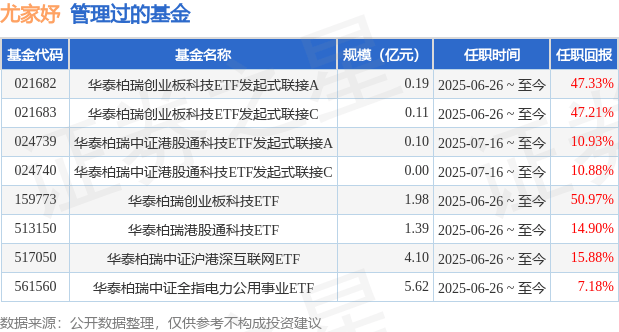 尤家妤女士:中国国籍,香港大学理学硕士。2021年1月加入华泰柏瑞基金管理有限公司,历任指数投资部助理研究员、研究员、基金经理助理。2025年06月26日担任华泰柏瑞创业板科技交易型开放式指数证券投资基金发起式联接基金、华泰柏瑞中证港股通科技交易型开放式指数证券投资基金、华泰柏瑞中证全指电力公用事业交易型开放式指数证券投资基金、华泰柏瑞中证沪港深互联网交易型开放式指数证券投资基金、华泰柏瑞创业板科技交易型开放式指数证券投资基金基金经理。2025年7月16日担任华泰柏瑞中证港股通科技交易型开放式指数证券投资基金发起式联接基金基金经理。