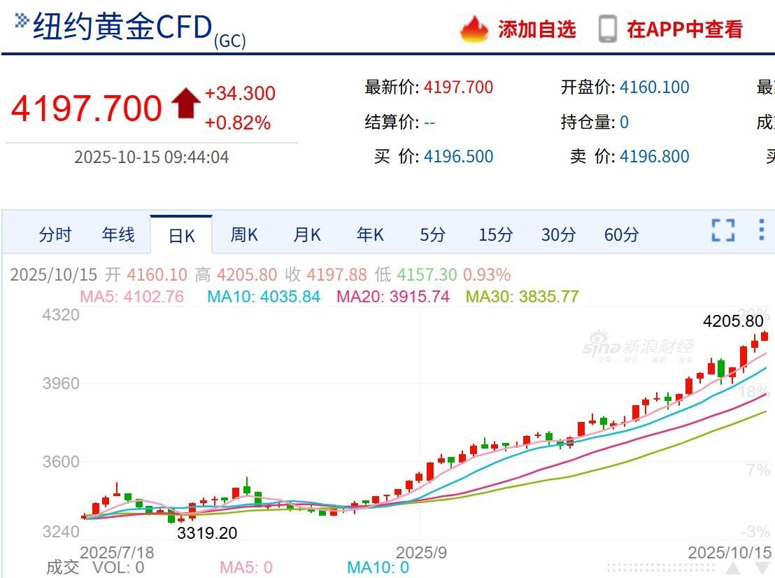 10月15日,纽约期金突破4200美元/盎司关口,再创历史新高。