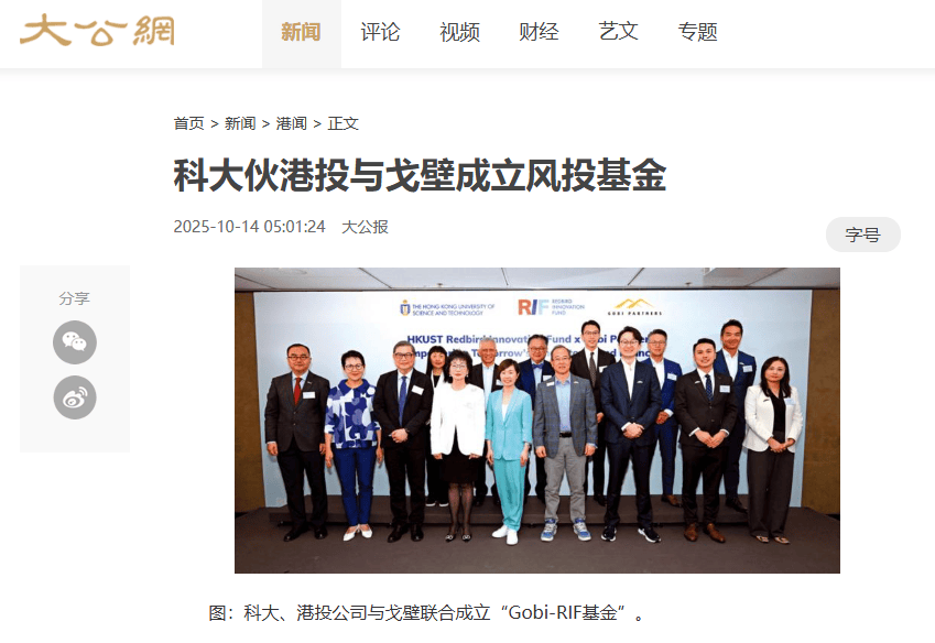 投资界10月15日消息,据大公报报道,香港科技大学、港投公司与戈壁创投近日宣布成立一支全新战略基金“Gobi-Redbird Innovation Fund(Gobi-RIF)”,作为RIF框架下的第二支风险投资基金,重点培育由科大孵化的早期初创企业。