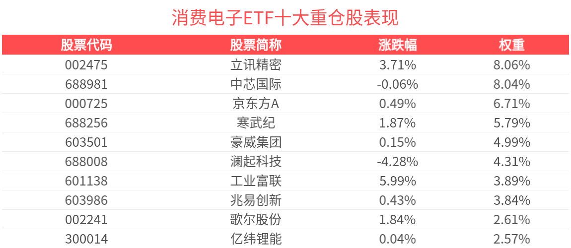 数据显示,截至2025年9月30日,中证消费电子主题指数(931494)前十大权重股分别为立讯精密(002475)、中芯国际(688981)、寒武纪(688256)、工业富联(601138)、澜起科技(688008)、京东方A(000725)、兆易创新(603986)、豪威集团(603501)、亿纬锂能(300014)、华工科技(000988),前十大权重股合计占比55.93%。