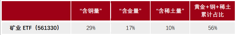 在降息大背景下,金融属性有望催化铜价上行,资源股板块有望受益。矿业ETF(561330)聚焦拥有有色金属矿产资源的龙头公司。从行业分布看,矿业ETF标的指数中黄金、铜、稀土累计占比56%。(数据来源:Wind,截至2025/9/30。行业分布按照申万三级行业分布计算。)
