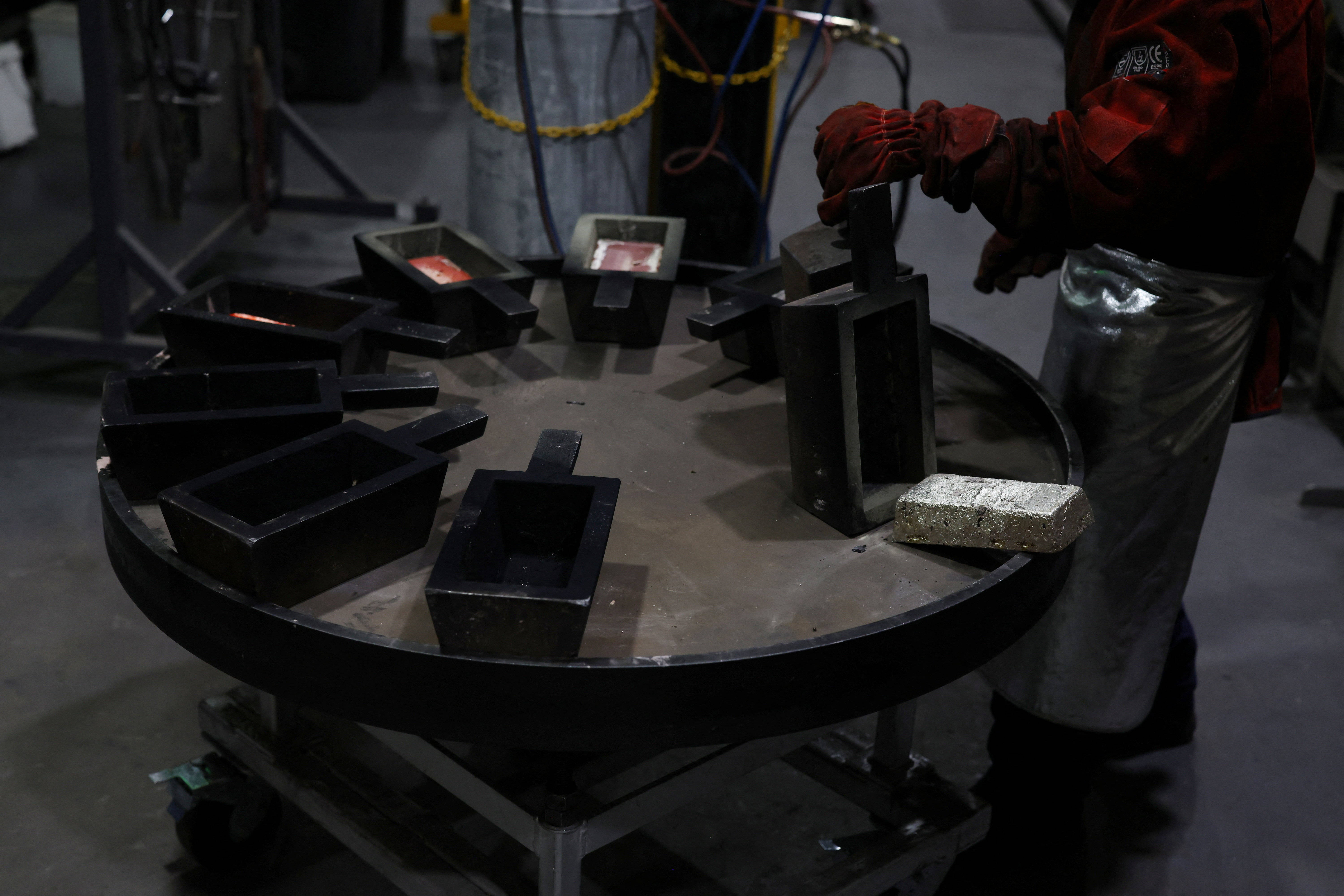 10月13日,工人在澳大利亚悉尼的一家黄金精炼厂铸造金砖。 新华社/路透