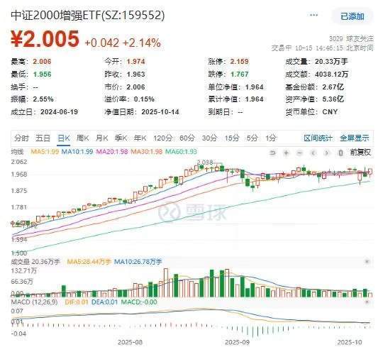 10月15日,两市持续拉升。截至14时42分,指增之王中证2000增强ETF(159552)涨2.09%,今年以来累计涨53.80%,较基准指数超额22.45%。