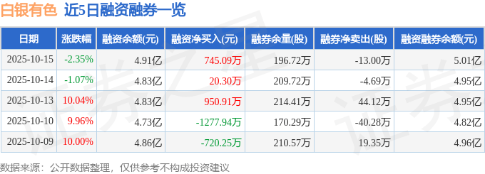 白银有色融资融券信息显示,融资方面,当日融资买入1.53亿元,融资偿还1.45亿元,融资净买入745.09万元,连续3日净买入累计1716.31万元。融券方面,融券卖出9.09万股,融券偿还22.09万股,融券余量196.72万股,融券余额1062.29万元。融资融券余额5.01亿元。