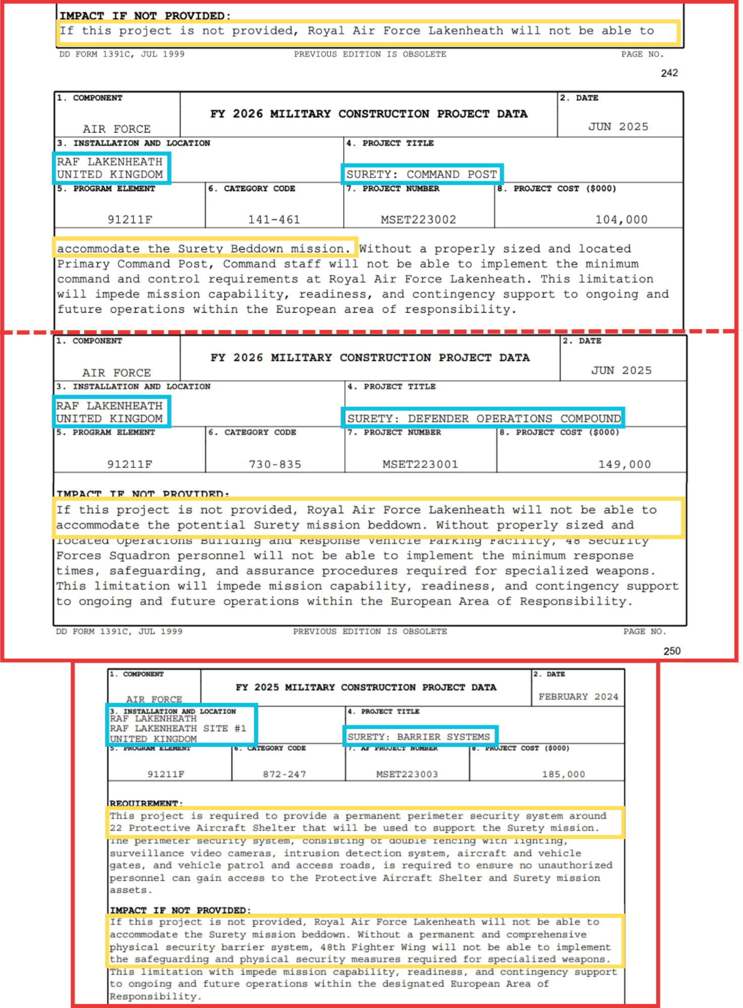 2026财年空军预算中列出的第二个项目是位于英国皇家空军莱肯希斯基地的“防御者作战大院”,其中包括一系列与安全相关的基础设施、人员和作战支持,因为现有能力被认为“不足以承担当前任务”。该项目旨在“增强安保能力,以支持皇家空军莱肯希斯基地可能部署的专用武器。专用武器保障包括有助于保障专用武器安全和可靠性的物资、人员和程序,并确保不会发生专用武器事故、事件、未经授权的武器爆炸或目标性能下降。”预算的这一部分重申了该项目对于莱肯希斯基地“适应潜在的‘保障’任务部署”的重要性。施工计划于2028年3月开始,预计于2031年6月完工。指挥所和防御设施这两个项目,在24财年和25财年的预算中均被列为“未来项目”。