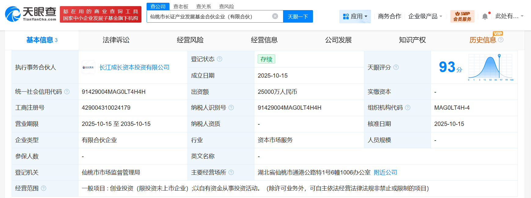 天眼查App显示,近日,仙桃市长证产业发展基金合伙企业(有限合伙)成立,执行事务合伙人为长江成长资本投资有限公司,出资额2.5亿人民币,经营范围为创业投资、以自有资金从事投资活动。合伙人信息显示,该基金由仙桃市高新技术产业投资有限公司、长江成长资本投资有限公司共同出资。